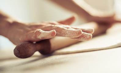 Woman rolling dough on wooden table with wooden rolling pin