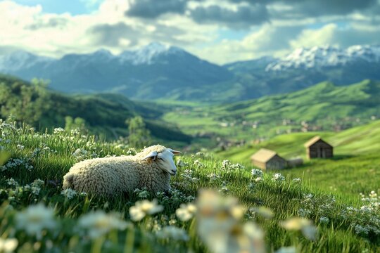 Sheep resting on a hillside farm surrounded by vibrant green fields and rolling hills, peaceful rural landscape with grazing animals