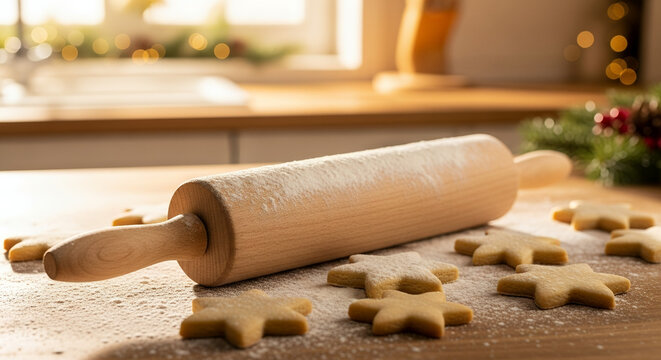 Wooden rolling pin with star-shaped cookies on kitchen counter