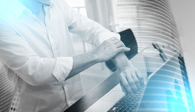 Mature man standing on roof of a high-rise building, rolling up sleeves
