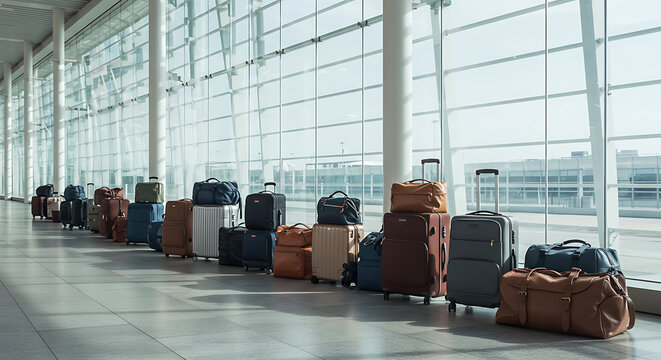 Ready for Departure: A row of stylish luggage, including rolling suitcases and a chic travel bag, stands ready for an exciting journey, with a blurred airplane in the background.