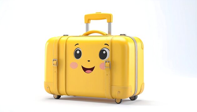 A cheerful, cartoonish yellow rolling suitcase with a smiling face.