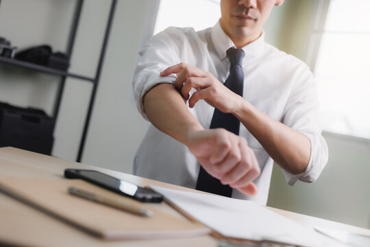 Attractive businessman rolling up his sleeves on his shirt, preparing for relaxation with a beer and burger.
