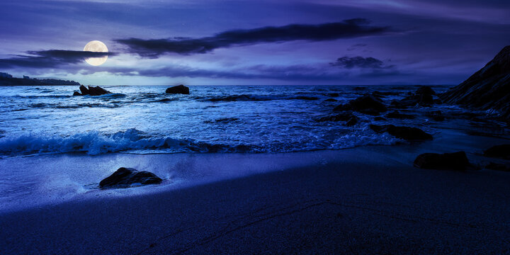 sandy beach at night. beautiful seascape background. calm waves washing the shore. clouds glowing in full moon light. summer vacation and relaxing recreation concept
