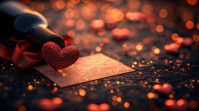 Wine bottle, heart, card on glitter, bokeh background, romantic setting