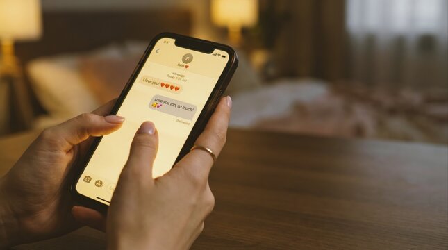 woman texting romantic messages on smartphone in cozy dimly lit bedroom environment