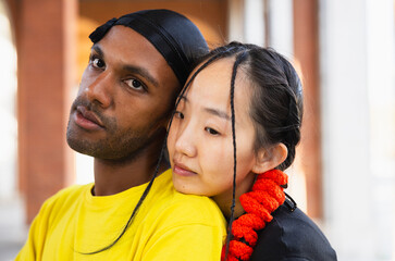 Love and travel people together. One man hug woman from behind in romantic outdoor leisure activity together. Desert scenic landscape in background with windmills and sunset time. Adventure traveler