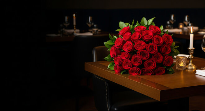 A large bouquet of red roses on a table set for a romantic dinner in a dark, upscale restaurant with a lit candle and wine glasses. Use for Valentine's Day, fine dining ads, or wedding planning.