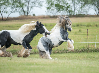 Two playful dogs enjoy their time together in a vibrant outdoor dog park, showcasing their friendly nature as they romp and leap in the lush green surroundings of the dog park.