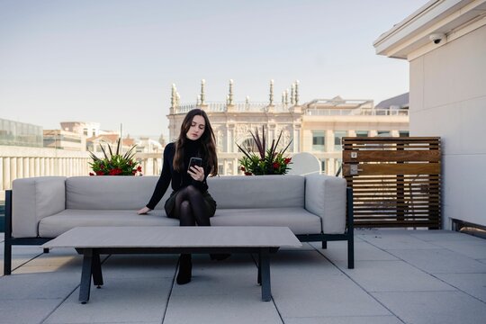 Young woman relaxing on rooftop with smartphone