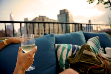 Rooftop dining at sunset: elegant four women sharing wine and dinner with city skyline