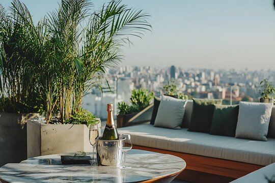 Elegant rooftop garden with tall green plants, minimalist outdoor furniture, plush cushions, and a champagne bucket on a marble table, contrasting with the vibrant city below