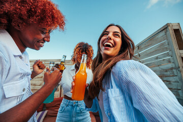 Joyful friends socializing on rooftop
