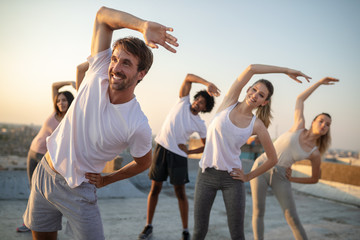 Fitness, wellness and couple doing outdoor yoga stretching together on a rooftop of a building. Happy, smile and young man and woman doing a pilates warm up exercise or workout for health in nature.