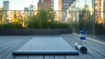 A minimalist rooftop yoga space with a mat and water bottle, framed by urban skyscrapers, provides an oasis of calm above the bustling city.