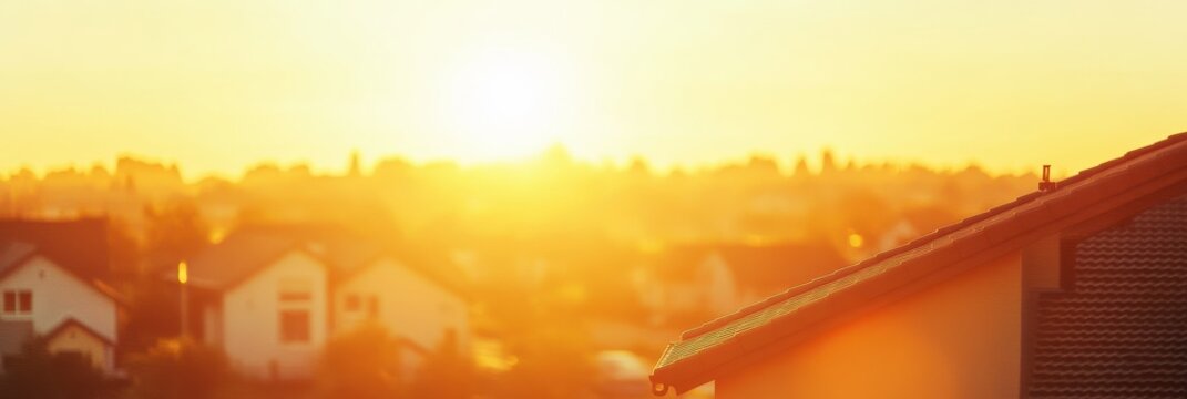 Warm sunrise over residential rooftops in a peaceful suburban neighborhood