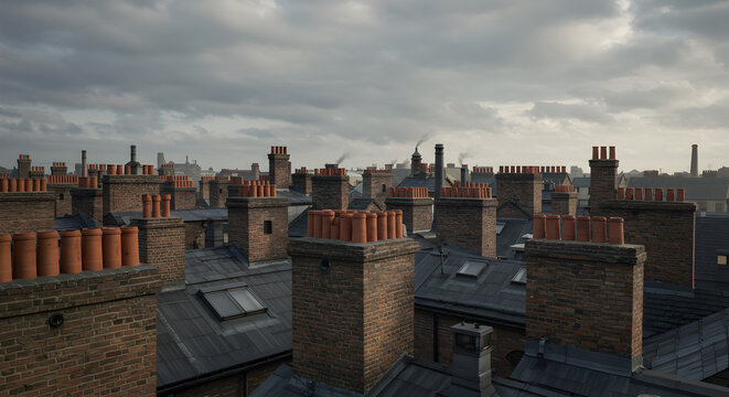 Atmospheric Victorian Rooftop Vista Featuring Chimneys and Dramatic Sky
