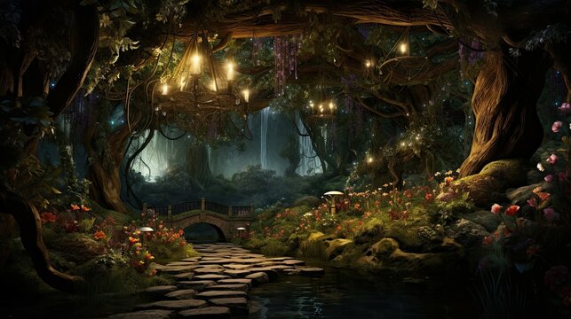 A mystical forest scene with tall trees, sunlight filtering through the foliage, and a winding path covered in moss-covered roots