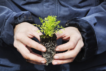 A gardener holding a small plug plant, with green leaves and a root network iin soil.