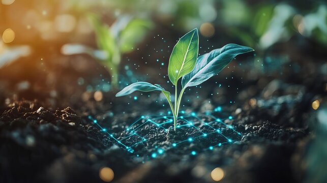 Young green plant sprouting in rich soil with network growing technology eco leaf stem root life farm