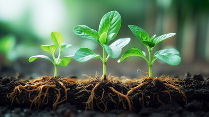 Sprouting green seedling with glowing blue root network symbolizing tech-driven growth