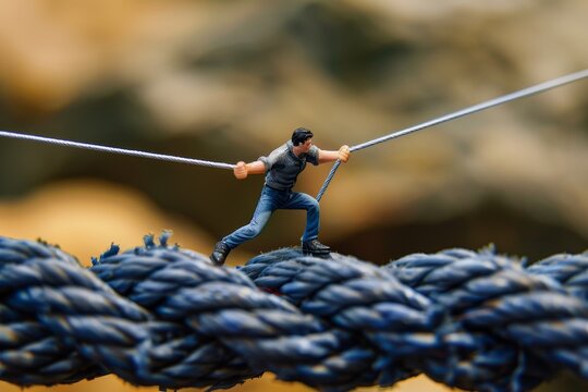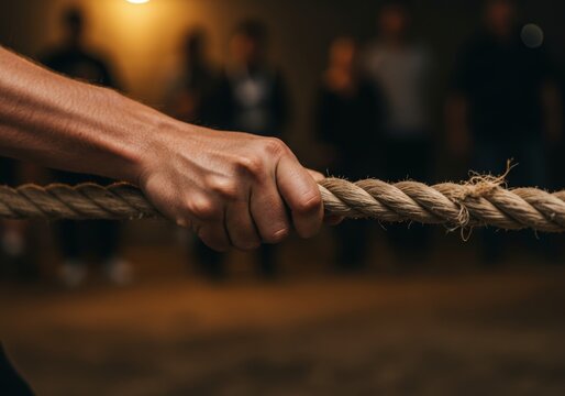 A hand tightly gripping a rope during a tug-of-war, with frayed strands showing the effort, struggle, and determination involved in overcoming challenges