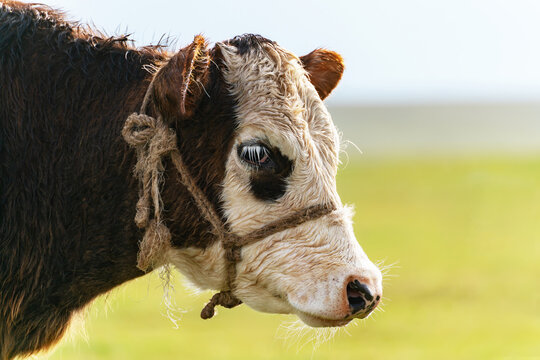 Portrait of a calf's head with wet fur in close-up. There is a halter made of rope on the muzzle.