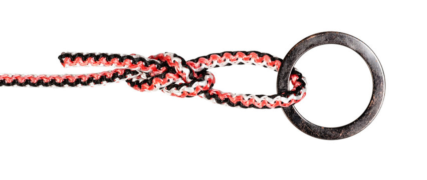 Climbing knotted rope on outdoor obstacle course with maroon sneakers on timber steps