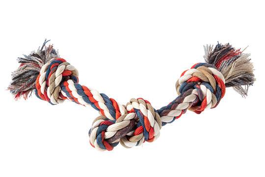 Chewable colorful dog rope toy with knots. isolated on white background.