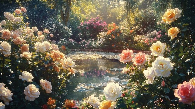 A romantic rose garden filled with blooming roses, romantic archways, and romantic garden decor Generative AI