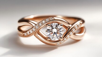 A rose gold ring with intertwined bands and a central brilliant diamond, glowing on white