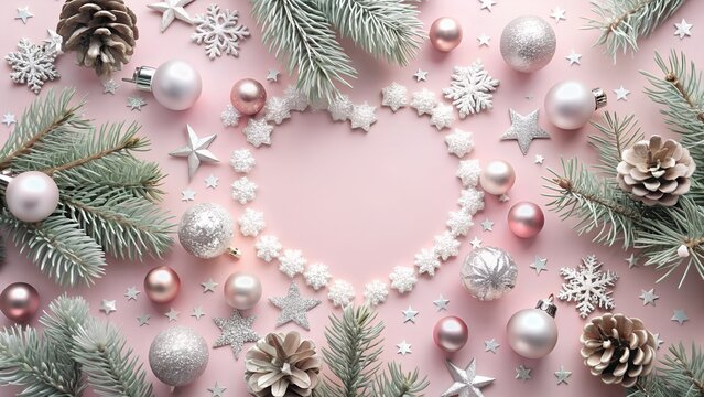 Pink Christmas Heart Shape with Ornaments and Pine Branches