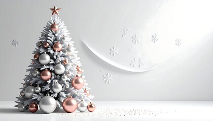 A pristine white Christmas tree is decorated with rose gold and silver ornaments. Snowflakes adorn a smooth background