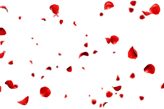 a falling or flying red rose flower petals isolated on a transparent background, Valentine's Backdrop