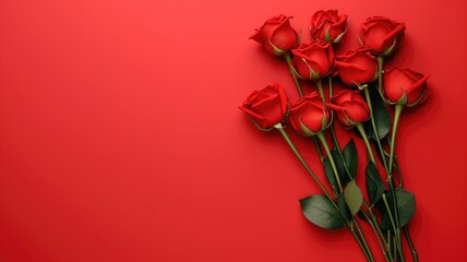A group of red roses with stems against a red background
