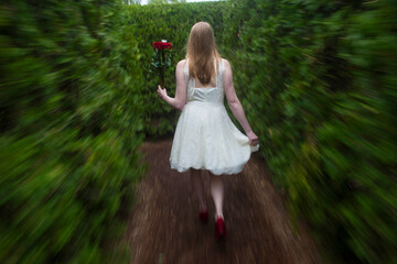 Young woman walks with bouquet of red roses in a garden area; Luray, Virginia, United States of America