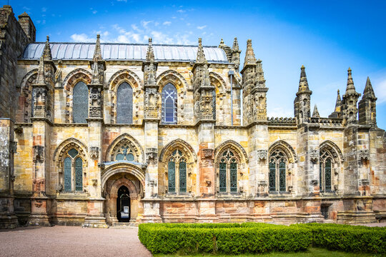 exterior of rosslyn chapel, borders, east lothian, scotland, uk