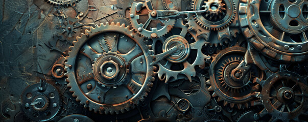 A dynamic industrial assembly line, with large rotating cogs and metal gears, creating an intricate flow of mechanical energy.