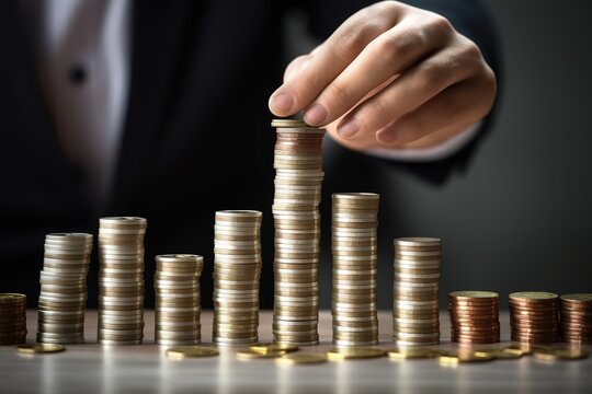 Showing gold coin stacks on digital finance dashboard with bar charts, line charts, metrics
