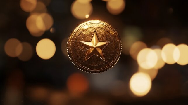 15.A realistic 3D gold coin with a star symbol, suspended in the air with a glowing metallic finish. The coin rotates slowly, displaying its sharp edges and reflective surface, ideal for a gaming or
