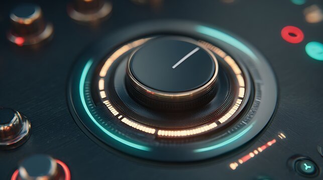 Close-up of circular control interface with neon buttons and rotating dial, sci-fi user interaction design .