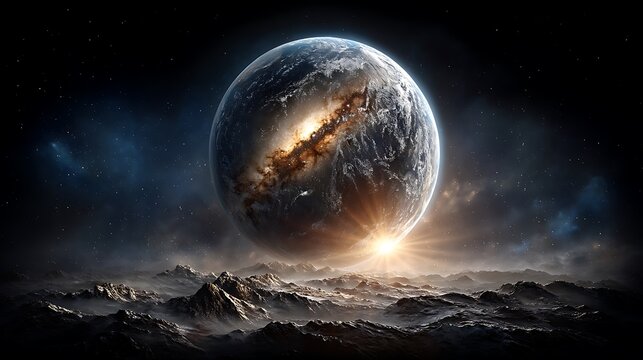 The planet Earth rotating with sun rays casting light on half the surface, with visible galaxy bands and stars, a cosmic view of environmental beauty.