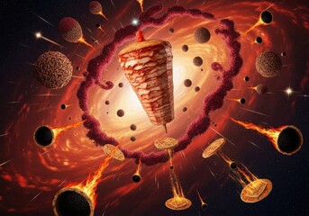 A giant rotating shawarma spit in the center of a swirling galaxy, surrounded by planets and cosmic phenomena