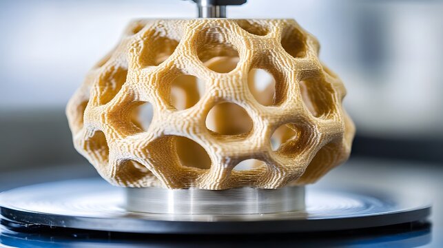3D printed spherical object with intricate lattice structure on a rotating platform.