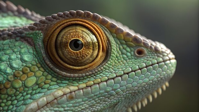 hyperrealistic 3d render of an orange chameleon with intricate scale detail iridescent highlights and intense focus in its rotating eye