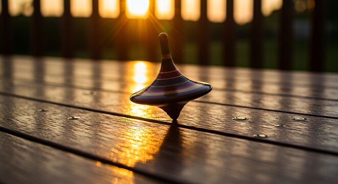 Spinning Top on Wooden Table at Sunset