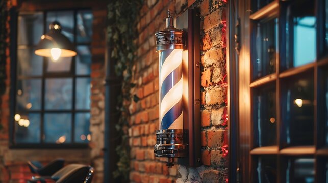 Barber pole of barbershop on vintage industrial wall in the evening Classic barbershop spinning cylinder to attract customers : Generative AI