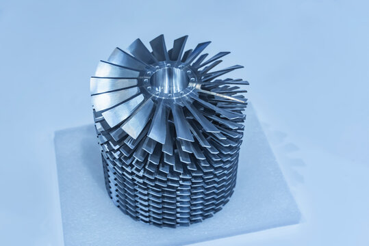 Close-up of industrial turbine blades.  Large, metallic turbine components, showing intricate blade designs, are in a factory setting