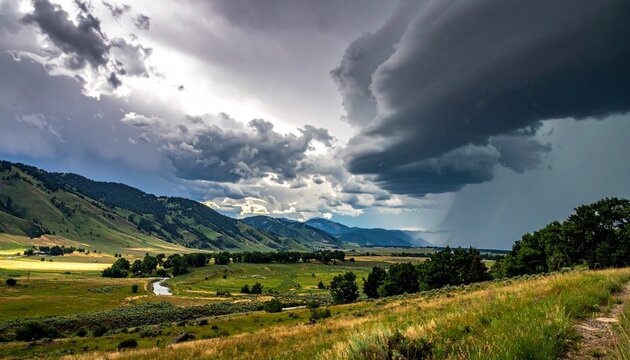 Storm cloud cyclone supercell thunderstorm dramatic sky extreme weather landscape prairie horizon field massive rotating storm cloud cyclone
