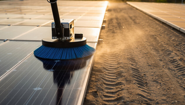 Efficient automated robot cleaning solar panel surface with blue rotating brush removes dust. Sustainable energy technology maintenance on photovoltaic farm boosts power